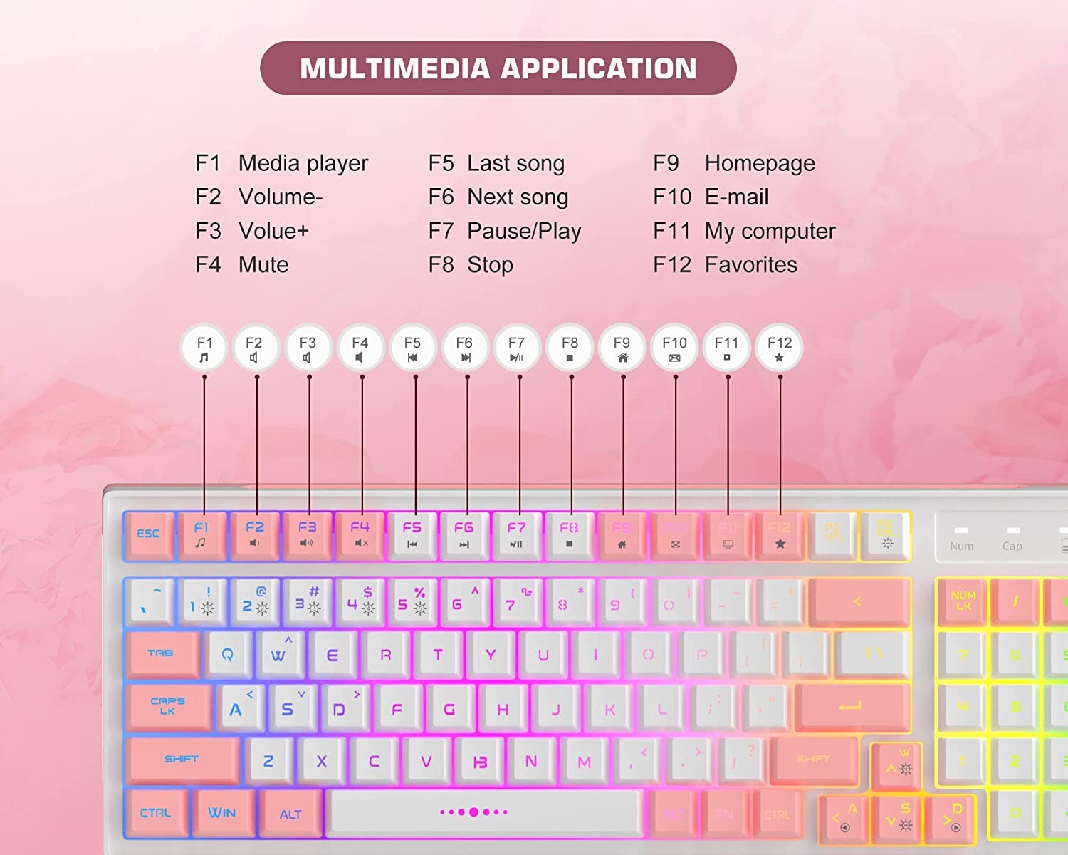 RGB lighting effect and waterproof design The keyboard has built-in cool RGB backlight effect, supports 5 light switching modes, adjusts different brightness levels and light moving speed, you can choose according to your needs. The keyboard surface has a certain waterproof function to protect yours. (Note: Do not immerse in water directly)