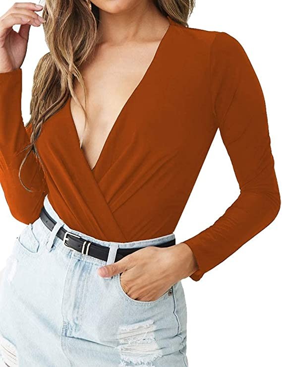 LINMON Women's Long Sleeve Bodysuit Diagonal Ruched Low Cut V Neck Stretch Jumpsuit Bodysuit, A1 Rust Orange, Small