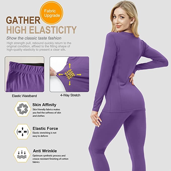 【Super Soft and Super Warm】(Size "M" fits 170cm, 60kg, 35" hips, based on customer reviews) Women's thermal underwear is made of 92% polyester and 8% spandex, which is skin-friendly and fits snugly around Your waistline and sleeves are gathered to reduce heat loss. These women's long johns are lightweight yet fleece lined to keep you warm in the cold winter months.