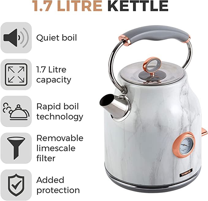 Tower Bottega T10020WMRG Traditional Kettle, Quick Boil, with Temperature Dial, Dry Out Protection, Automatic Shut Off, Silent, Stainless Steel, 3000 W, 1.7 L, Marble and Rose Gold