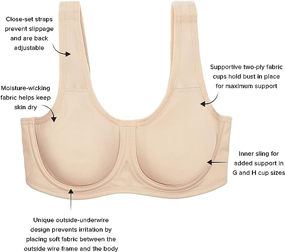 Outside underwire frame keeps breast motion to a minimum
