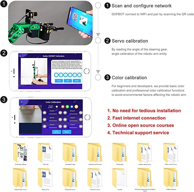• 【Top Configuration】Dofbot adopts 15kg intelligent serial bus metal gear digital servo, which is beneficial to control and read the angle of each steering gear individually; Equipped with a safety expansion board, reserved for continuous expansion; the robot arm is made of fully anodized Made of aluminum alloy, beautiful and sturdy structure